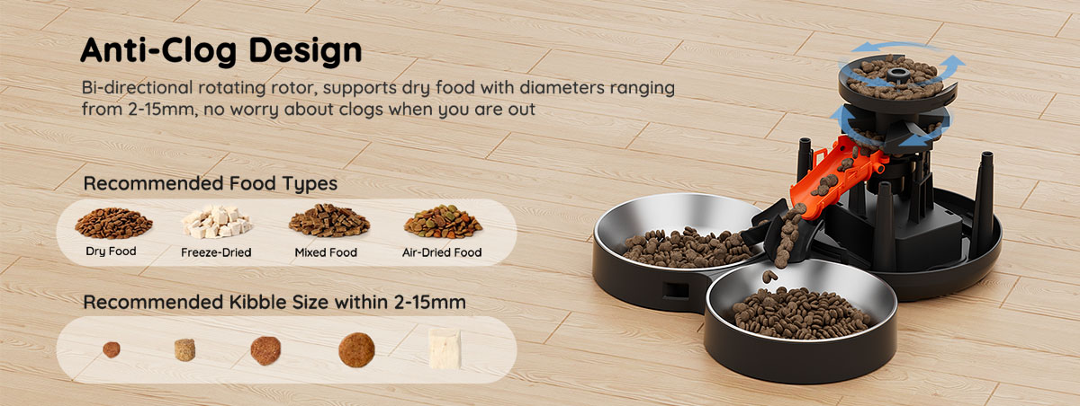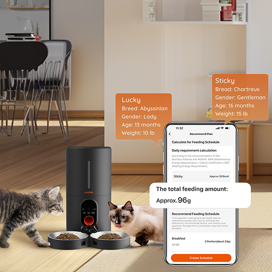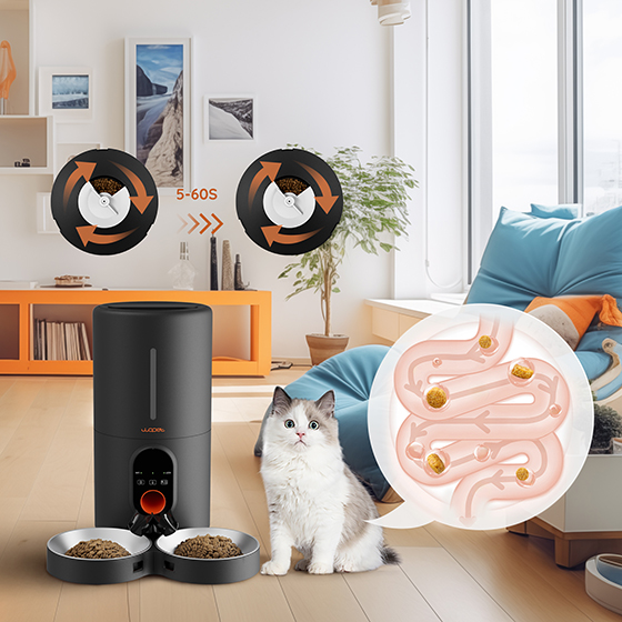 Feed Two Cats: WOPET automatic cat feeder for two cats equipped with a meal splitter. The meal splitter ensures even distribution of food, so your pet won't fight. You can check the feeding records to ensure that your cat or dog has been fed according to the established schedule through the app,You can also share the APP to your families to feed and monitor your pets feeding together.