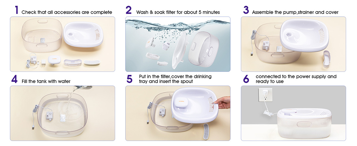 【Multiple Filtration System】 WOPET Pet fountain uses multiple filtration system. The carbon filter is made of various materials to effectively filter out dust, fine debris and soften the water. The pump filter attracts floating hair in the water dispenser. Purifying water your pets put into their tummy, drink without worries.For your pet's health and to ensure the fountain works properly, we recommend replacing the filter every 2 week.